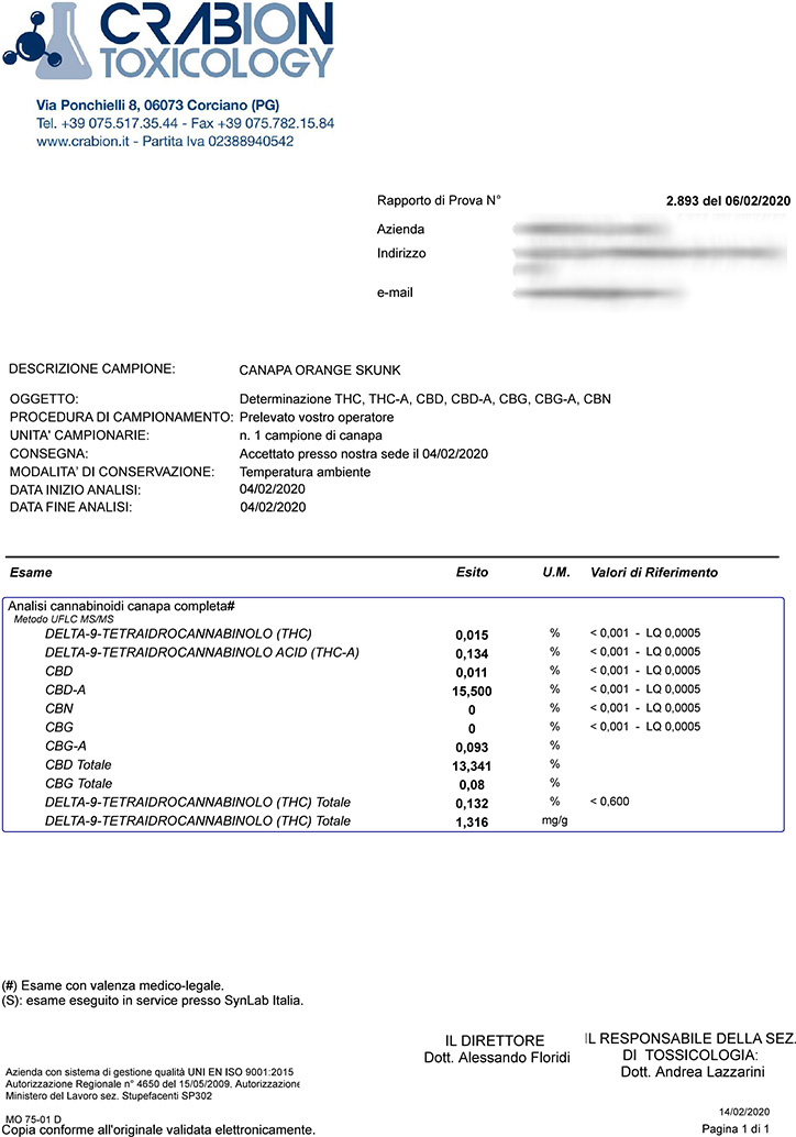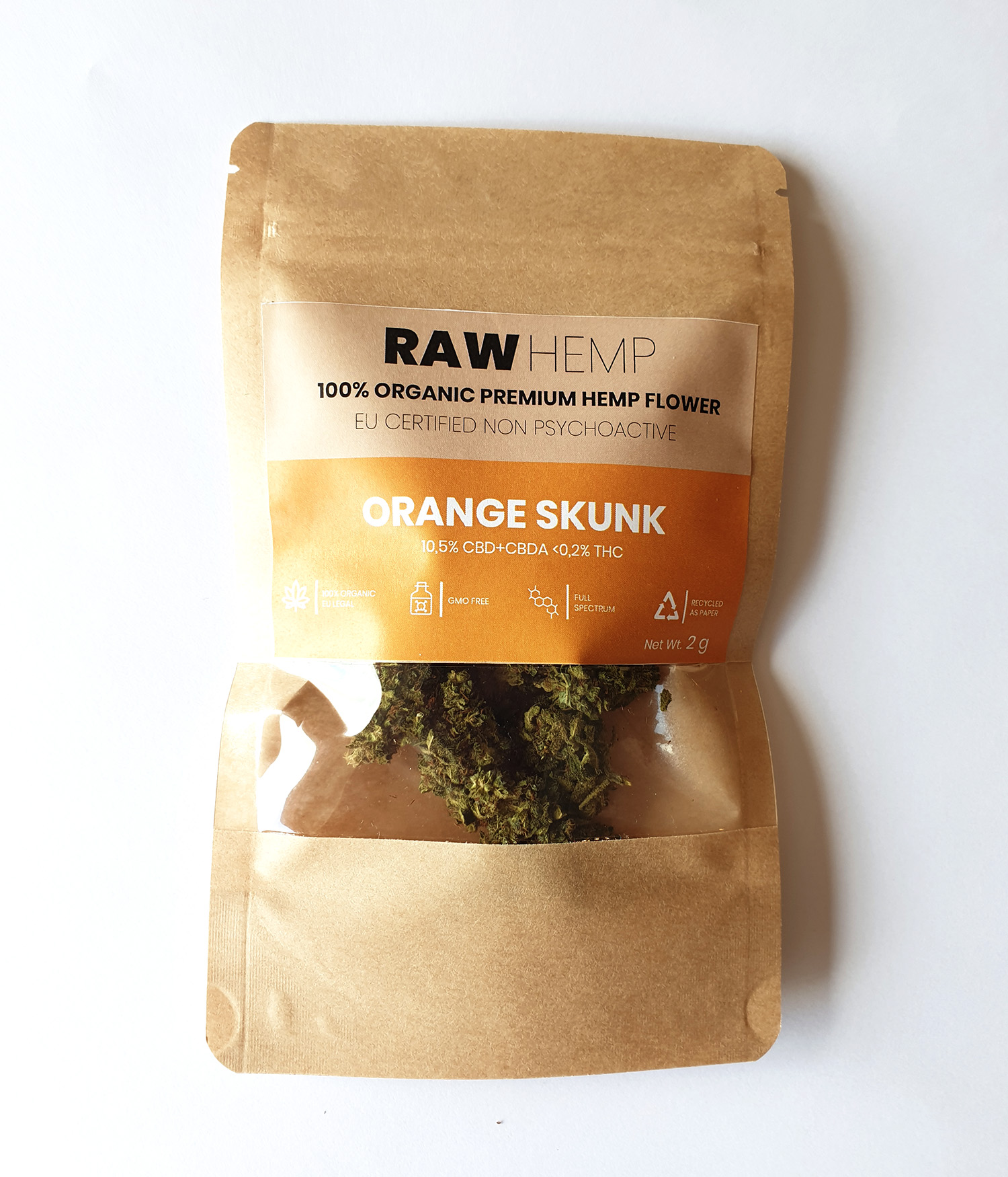 Orange Skunk är helt fri från frö, blad och kvistar. Budsen innehåller 13,4% CBD och mindre än 0,2% THC.